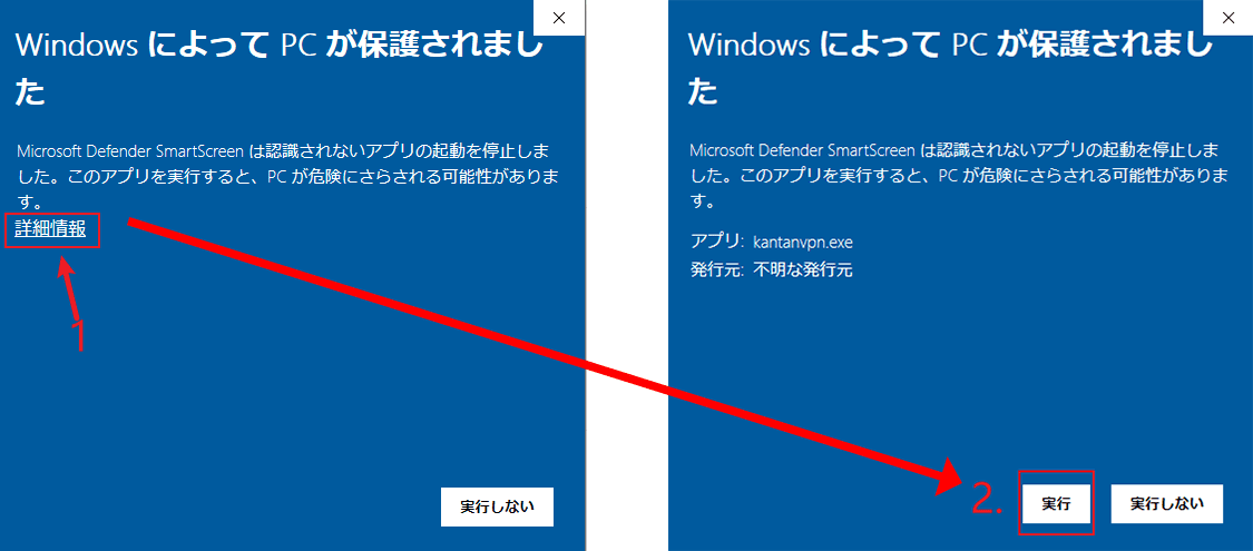 ※ インストール中にWindows Defenderからセキュリティ警告が表示された場合は、[詳細情報]をクリックしてインストールを続行してください(このアプリケーションは安全です)。