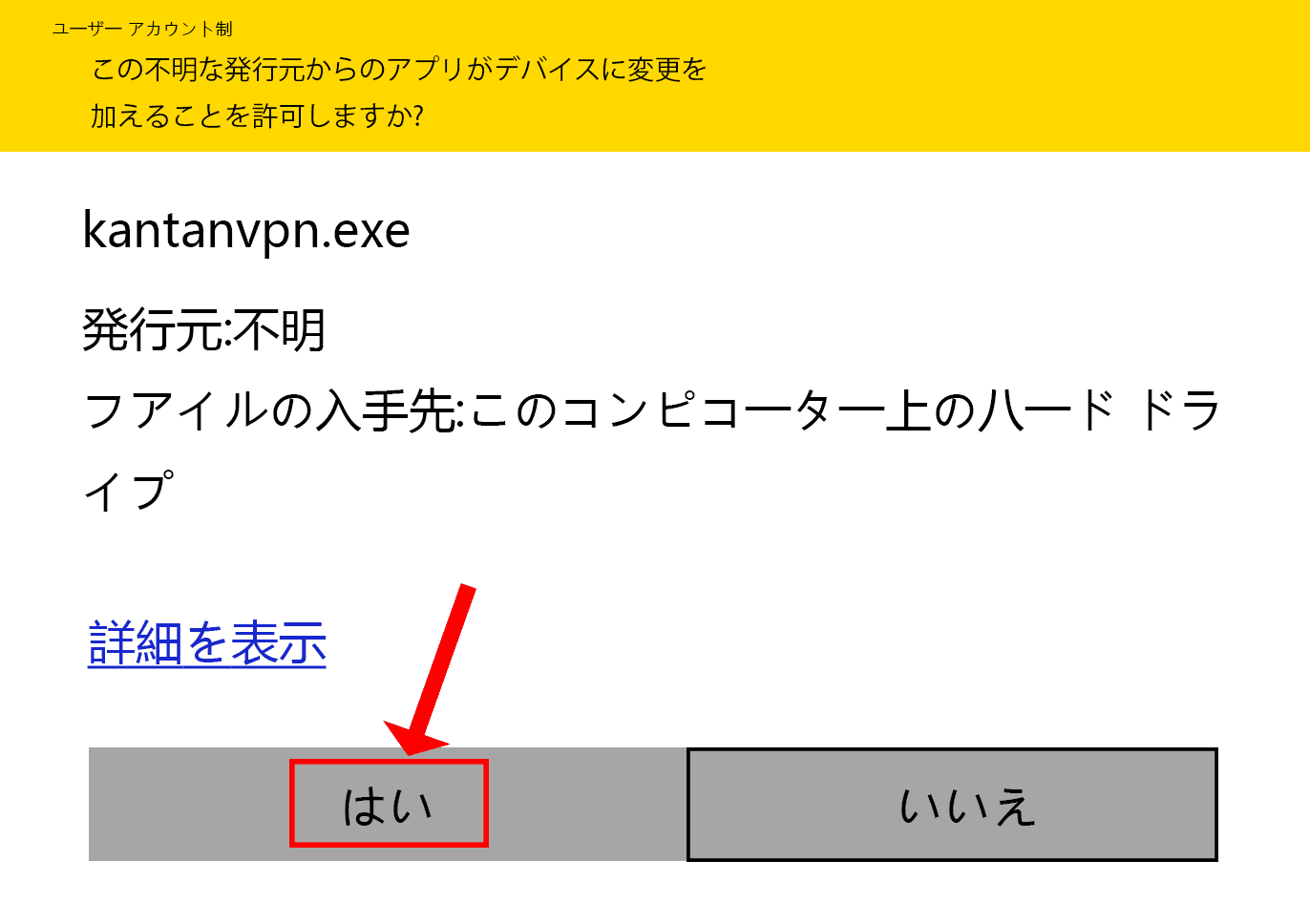 ダウンロードしたexeファイルを実行し、KanTanVPNアプリケーションをインストールして起動します。