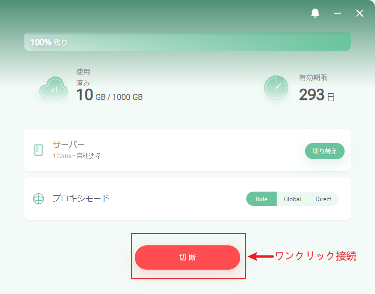 ※ ご注意:毎日コンピュータの電源を切るときは、VPN接続を切断してください。 VPN接続の切断を忘れると、次にコンピュータの電源を入れたときにインターネットにアクセスできなくなる可能性があります。 この場合、KantanVPNを開いて解決してください!